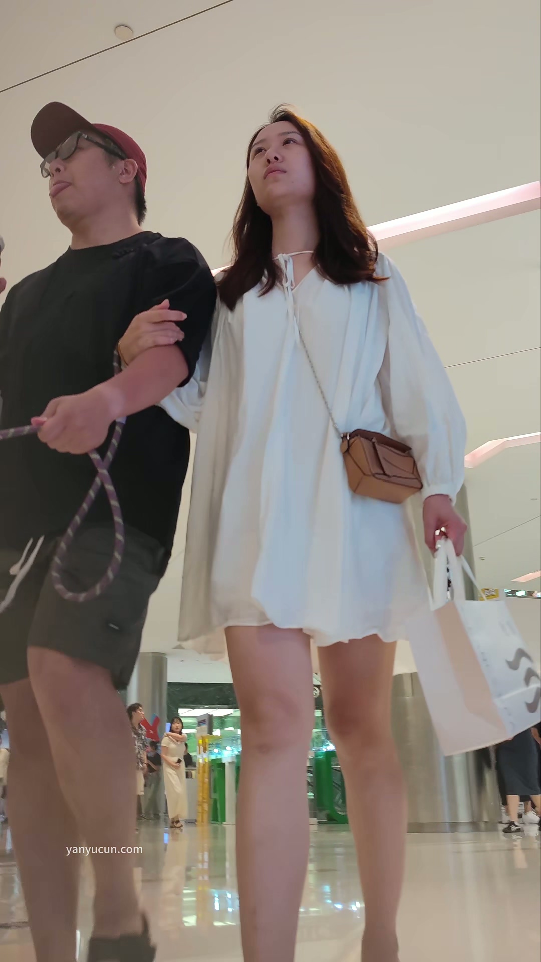 XM323白色连衣裙美女和老公牵着小狗逛街,白色内内