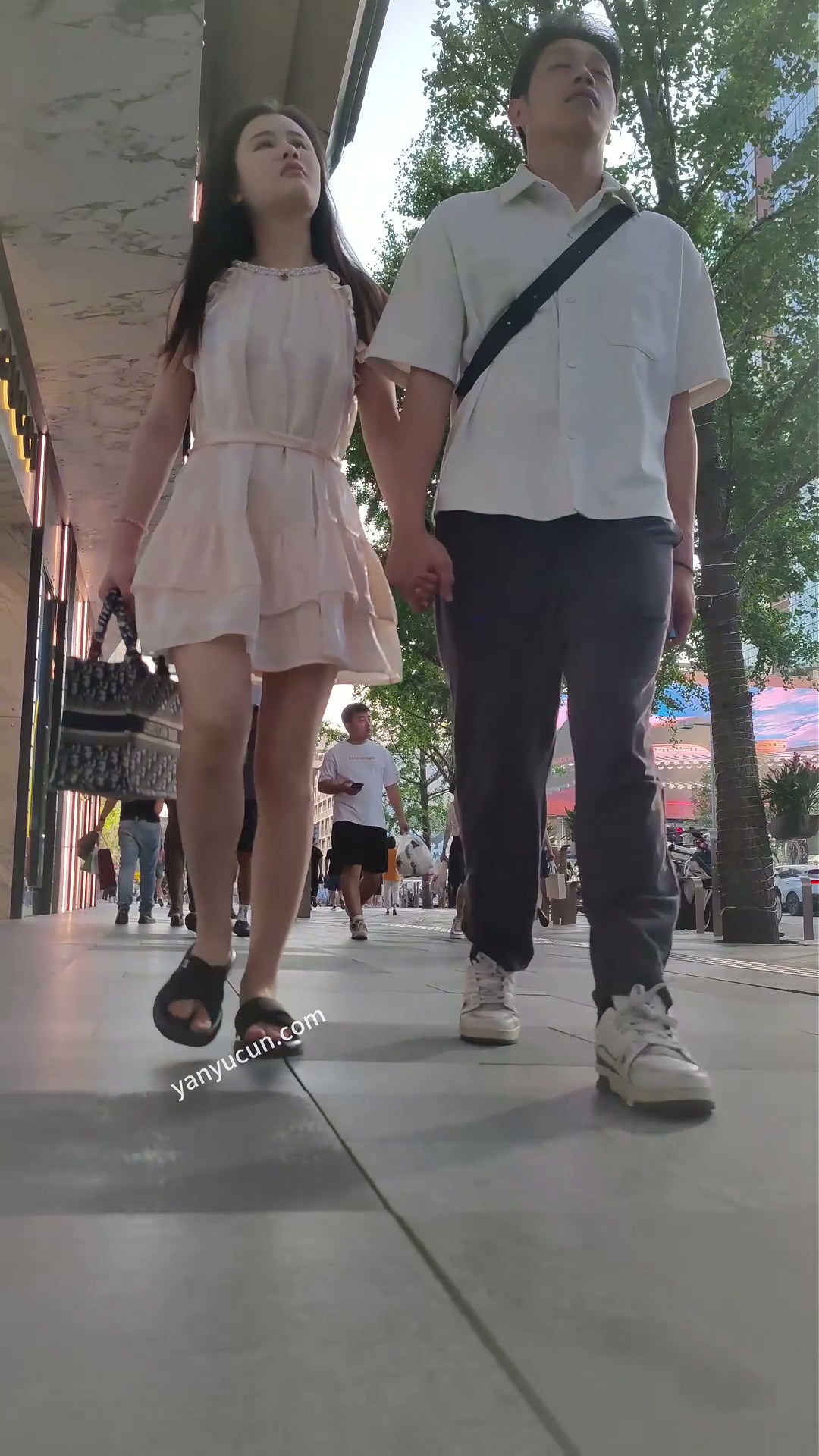 XM424粉色连衣裙小姐姐和男朋友逛街,白色内