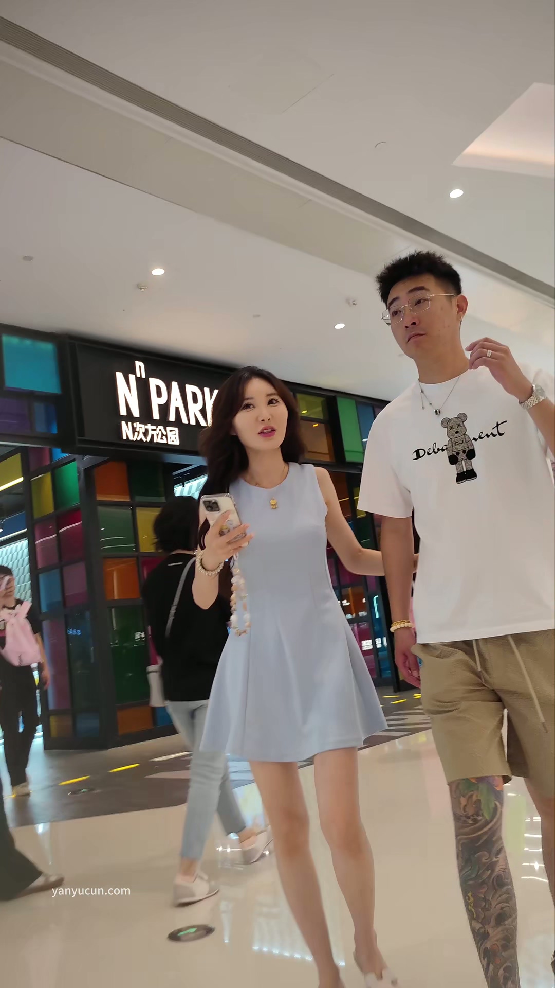 XM322蓝色连衣裙美女和男朋友逛街买衣服,白色窄内漏B边 ...