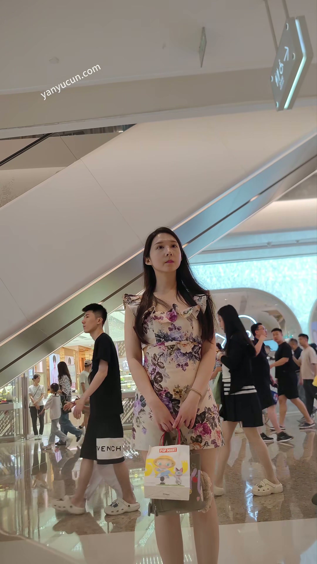 XM365黄色印花连衣裙极品气质美女和男朋友逛街,豹纹蕾丝内内