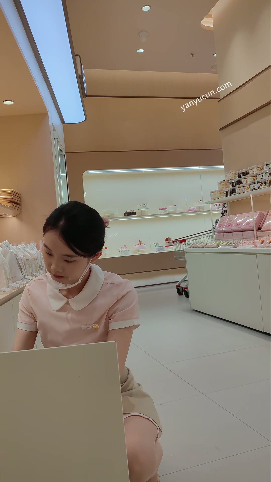 XM380好利来店员小姐姐肉色丝袜,专心工作期间抄底白色内内